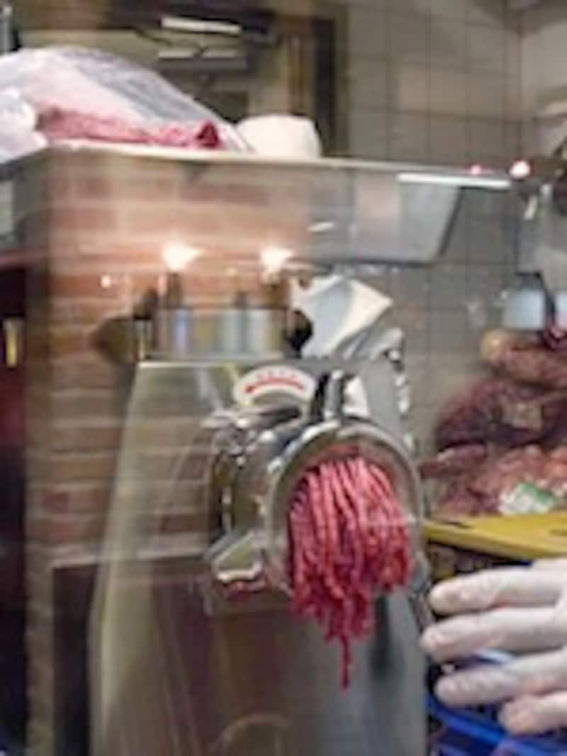 店内に入ってまず目を引くのはガラス張りになったパテ専用の厨房、パテファクトリー。目の前のミンサーではひっきりなしにブロック肉が挽かれていました。店の中心にこのファクトリーを備えることに、並々ならぬ自信を感じることができます。
