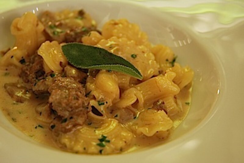自家製パスタ、クレステ・ディ・ガッロ イベリコ豚のソーセージとポルチーニ茸のクリームソースはちょっと変わった型のショートパスタに、濃厚な味と香りのクリームソースが絡まります。