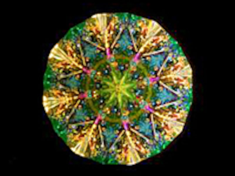 | 初めて本格的な万華鏡を覗くと、映像のシャープさに驚くはず!「表面反射鏡」という特殊な鏡が使われています。写真は2ミラー映像。 |