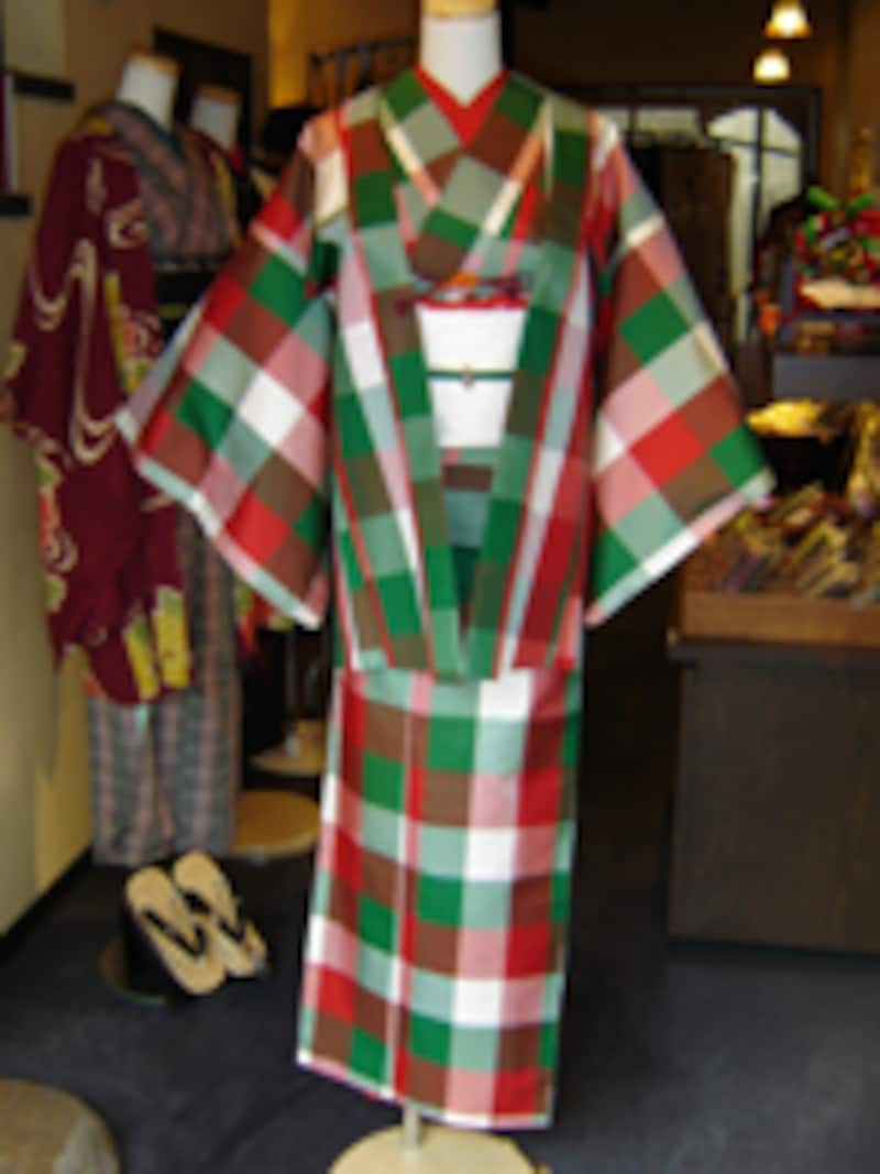| キュートなクリスマスカラーのアンサンブル。撮影後、店頭のディスプレイをご覧になったお客さまが、即お買い上げ~!着物アンサンブル¥12,600(売済)/名古屋帯¥26,250/帯締め¥1,680(表示の無いものは参考商品。帯揚げは手ぬぐいを利用) |