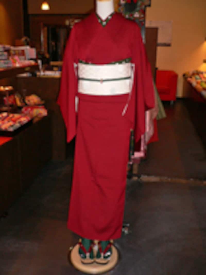 | 赤の色無地に白・緑のクリスマスカラーを組み合わせて。小技の効いたテクニックがとてもお洒落。その詳細は3ページにて!着物¥10,500/帯¥26,250/帯締め¥1,680/草履¥21,000(表示の無いものは参考商品です) |