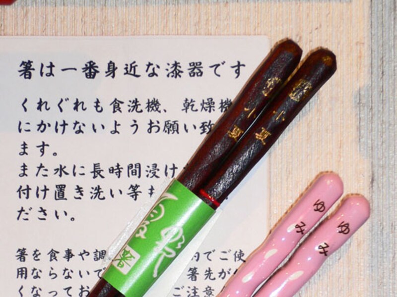 | 箸の名入れはこんな感じです(箸名入れ料:¥1,050~)。ピンクの箸は、ねじれ具合が持ちやすいと評判の「サイズ箸珊瑚」シリーズ(ピンク・青・水色・オレンジ・黄色・緑)。 |