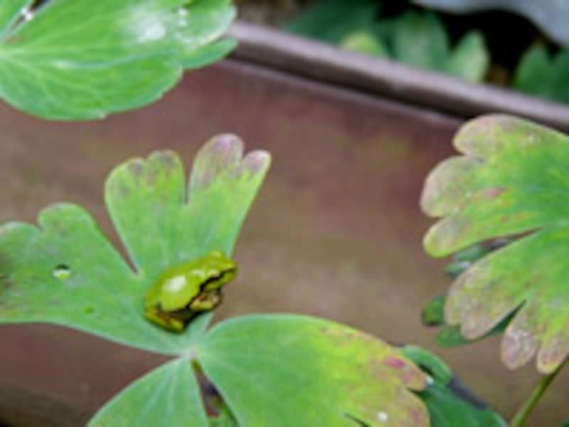 | 【豆知識】雨が近づくと空中の湿度に反応して植物の上の方に移動する習性もあるそうで、「アマガエルが上に向かうと雨になる」という見方もあります。 |