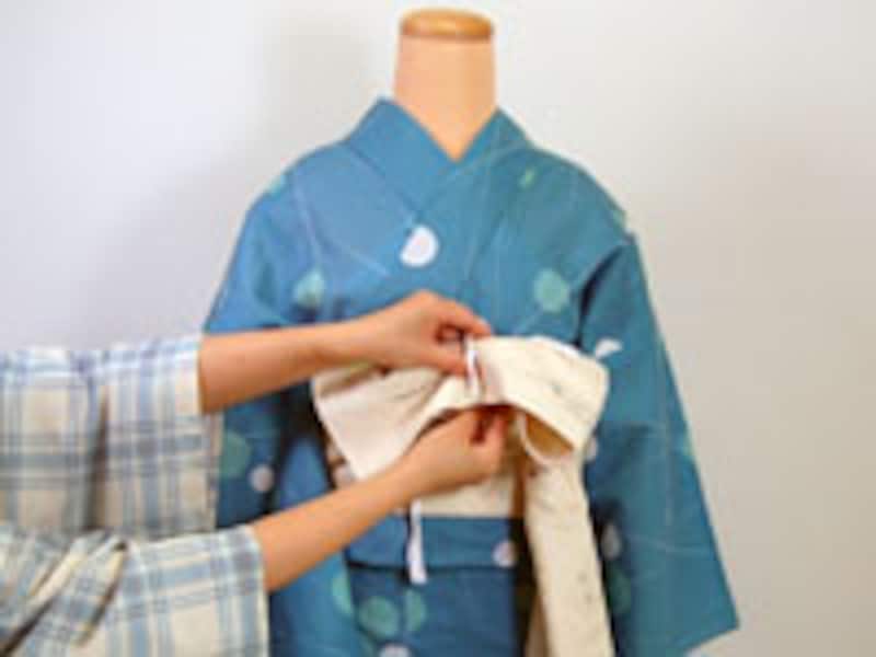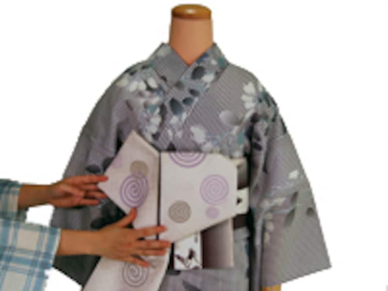 文字通り、浴衣はお風呂上りに着るものとして誕生したので、最小限の下着でさらりと着てもいいのですが、街着にする場合には補正が大切です。よく、洋服の時と同じようにウエストのくびれを強調して帯を結んでいる方を見かけますが、着姿は決して美しくなく、すぐに着崩れてしまいます。また、ウエストのくびれがなければ補正は要らないと思いこんでいる方も多いのですが、これも間違い。全くストレートな体型の方はいませんので、きちんと補正をしたほうが美しいのです。