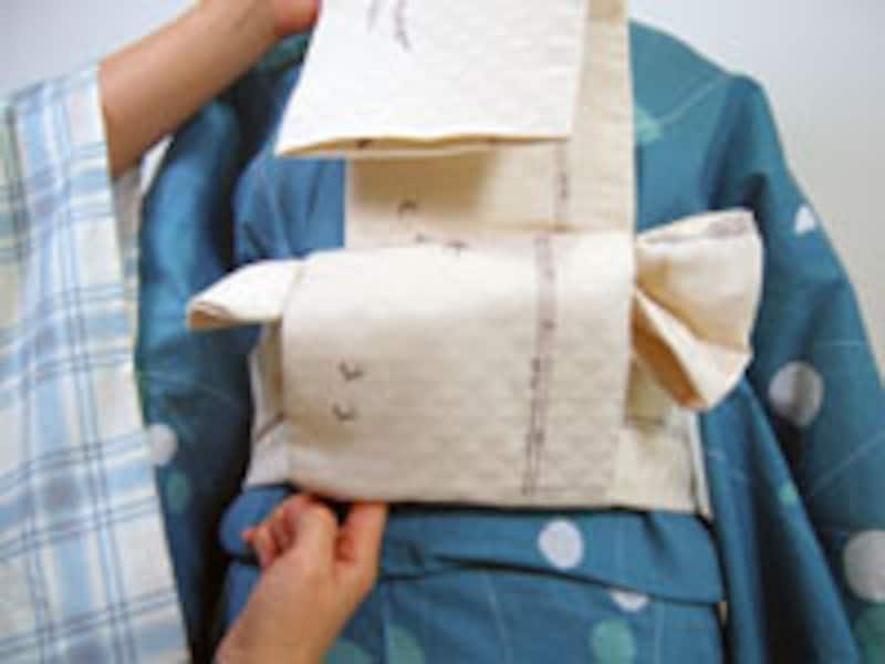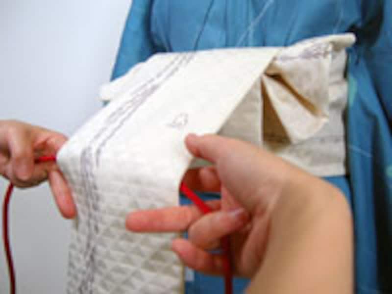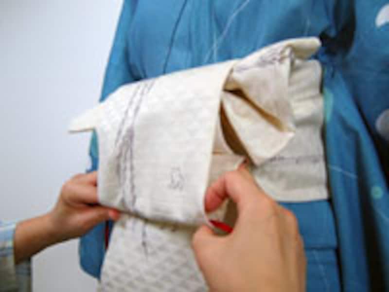 垂れ下がっている正面の柄がお太鼓になりますから、リバーシブル帯などで出したい柄が出ていない時は、根元をねじって柄が正面にくるようにしておく。