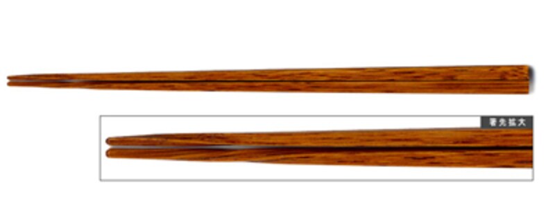 うどんに比べて細いそば箸。持ち手側が少し細くなっている(これを利休型といいます)ので動かしやすく、箸先はそばがつまみやすいように四角く面取りされています。ただし、細打ちのせいろそばの場合、ほんの少しだけせいろに残ったそばをつまむ時に、箸使いの下手な方はつまみにくいかもしれません。