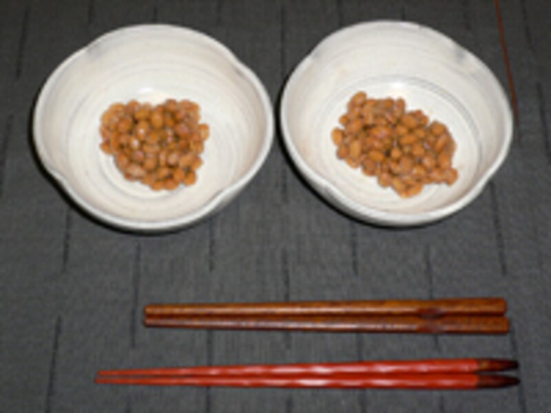 | 左:普通箸で50回かき混ぜた納豆/右:納豆箸で50回かき混ぜた納豆 |