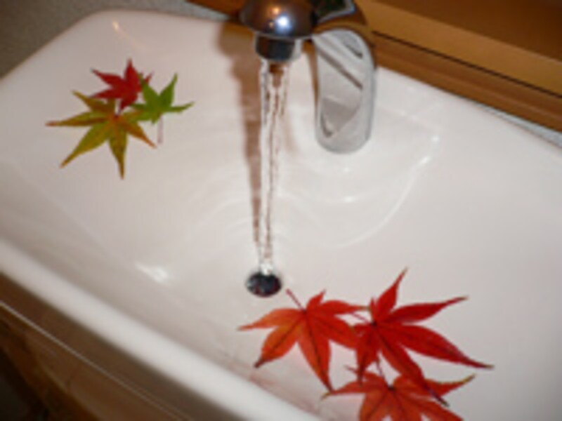 こちらもサッと洗って、配置するだけ。水の流れを妨げないよう配慮しながら、レイアウトを考えるもの楽しいものです。実用的ではありませんが、トイレのような狭い空間で秋の風情を感じるというのも乙なもの。1日だけ、または来客時のサプライズ演出として楽しんでみてはいかがでしょう。