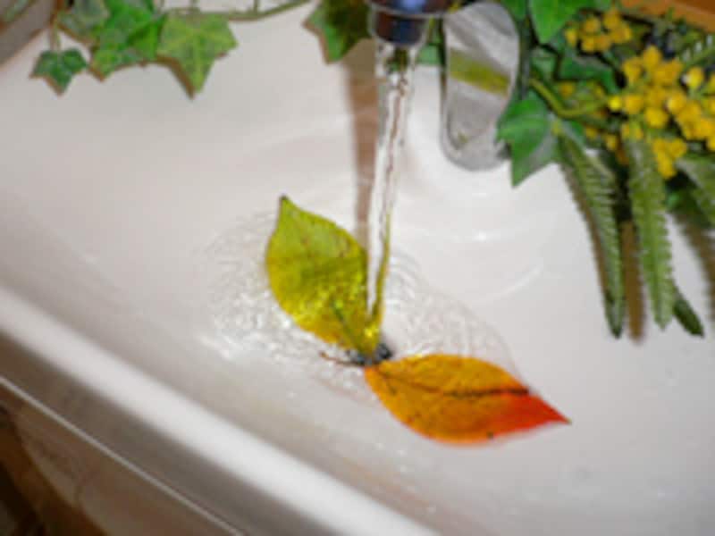 拾ってきてすぐにできるのが、水周りのデコレーションです。落ち葉をサッと洗ってから、石鹸の下に敷くだけ。落ち葉は乾くとしなびてしまいますから、適度に湿り気のあるソープディッシュは好環境なのです。