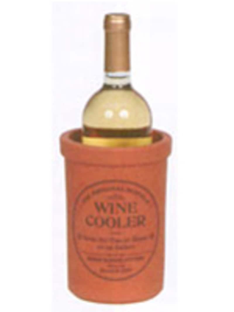| テラコッタ製ワインクーラーは、気化熱を利用して冷たさをキープするもの。使用前に水に浸し、水も氷も入れずに冷やしたワインを入れるだけです。素焼きの表面にしみ出した水が急速に蒸発し、気化熱が奪われることで低い温度に保ってくれます。 |