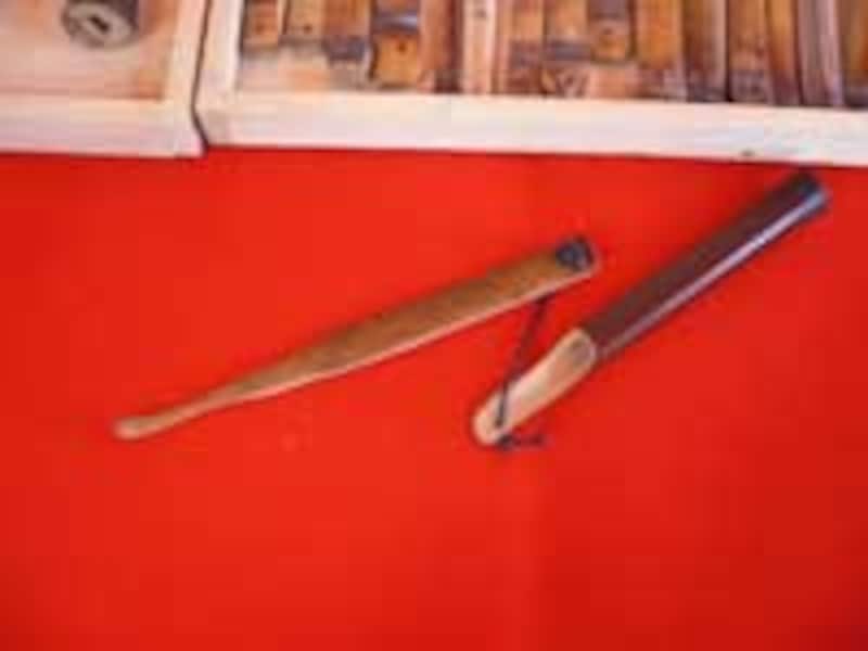 | 茶道具職人でもある玉三郎さん手作りの耳かき(カバー付/1,200円)。裏側に「玉三郎作」と烙印がついています。 |