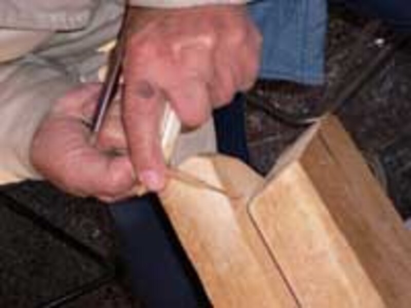 | 購入者本人が耳かきしながら、反り具合や肌触りなどをチェック。その場で削り、磨きをかけて仕上げてくれます。写真はイノシシの牙(!)で磨いているところ。ほぼ毎月出店しており、購入後でも調整に応じてくれるそうです。 |