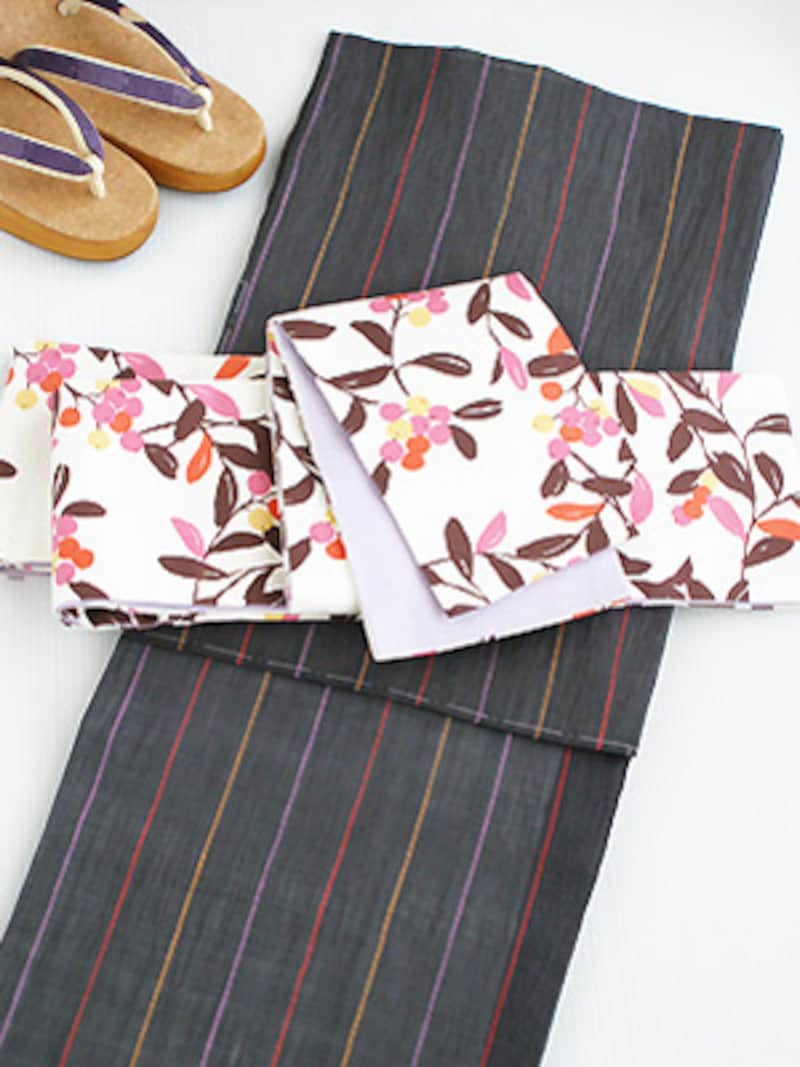 | 「neon・ネオン」は全5色。こちらはチャコールグレイ地にレッド・パープル・イエローのストライプ柄(N-003) ※詳細は3ページ目です /帯:ベリー(赤)¥11,000 |