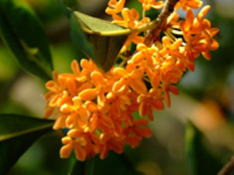 甘い香りを辿っていくと、橙色の金木犀(キンモクセイ)!雨や風で花が散りやすく、まるで絨毯のよう。雌雄異株で日本に雄株しか伝来しなかったため挿し木で増やします。白い花は銀木犀で、薄い黄色は薄黄木犀。