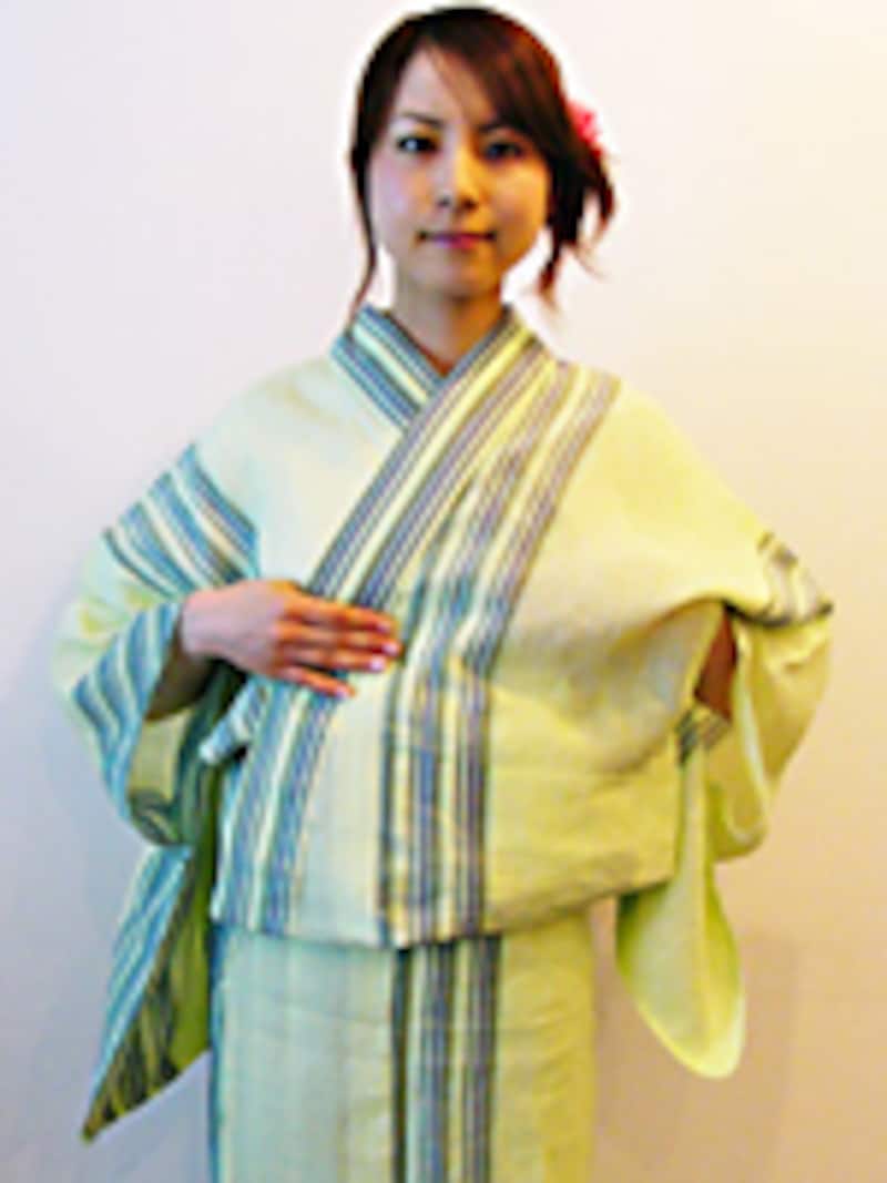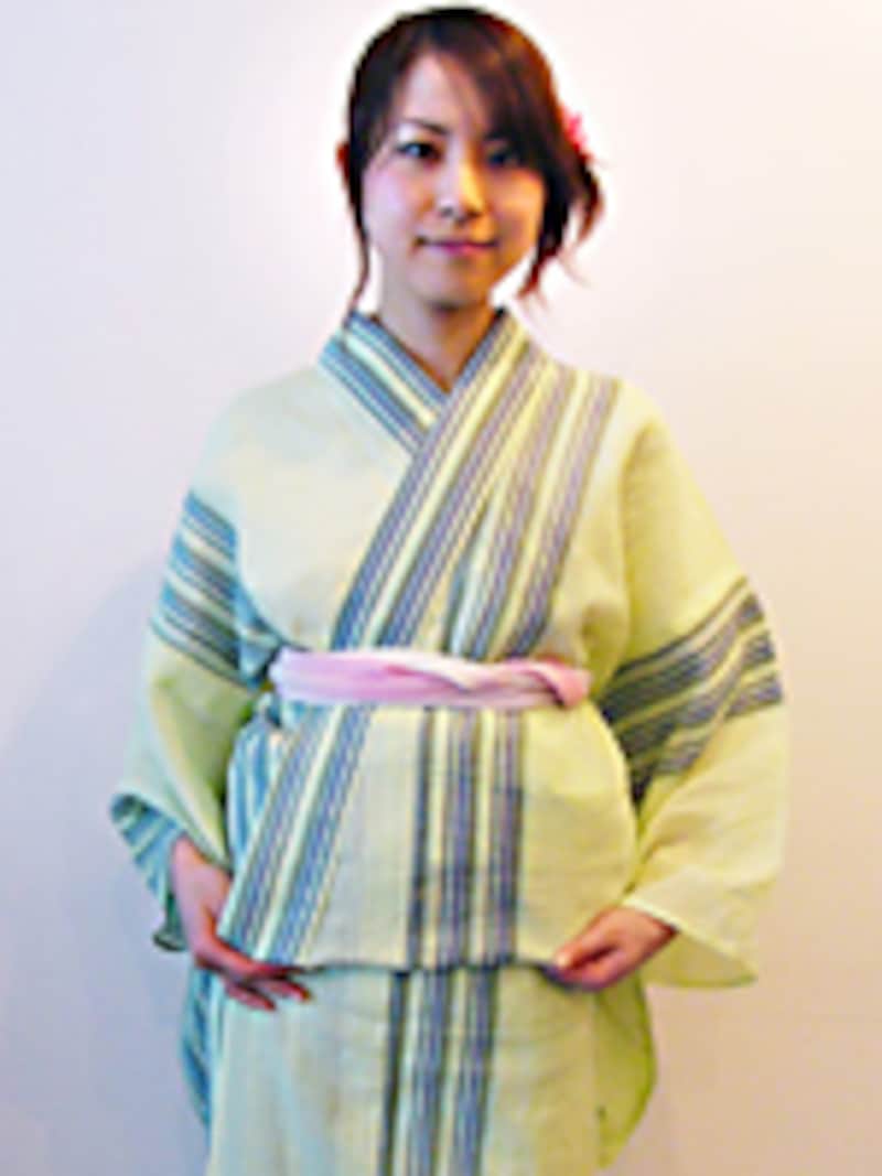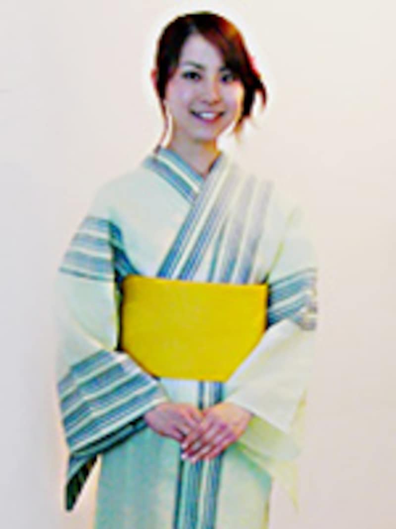 「襟は着ているうちに緩んできますから、最初は乙女のようにきっちり合わせておきましょう。胸紐は少し上で締めてから、下にずらすと胸元がすっきりします。胸紐にコーリンベルトを使う場合、ゴムだからと短くしがちですが、短いと次第に襟が詰まってきます。長めにして使い、肋骨の下の位置で留めましょう」![]() |