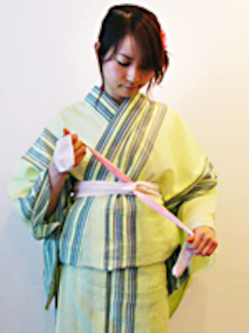「浴衣は着物より短めに着ますがバランスが大切。腰紐だけはしっかり締めますが、背中側だけ強く引いて腹部はしめつけないこと。また、補正タオルの上で結ぶと緩まず、痛くないので楽ちんです」着付けの紐は、ひと結びしてからねじって交差させ、両脇にはさみこむのが基本です。こうして結ぶと、結び目がゴロゴロしないので楽ちん! 紐が緩むこともありません。