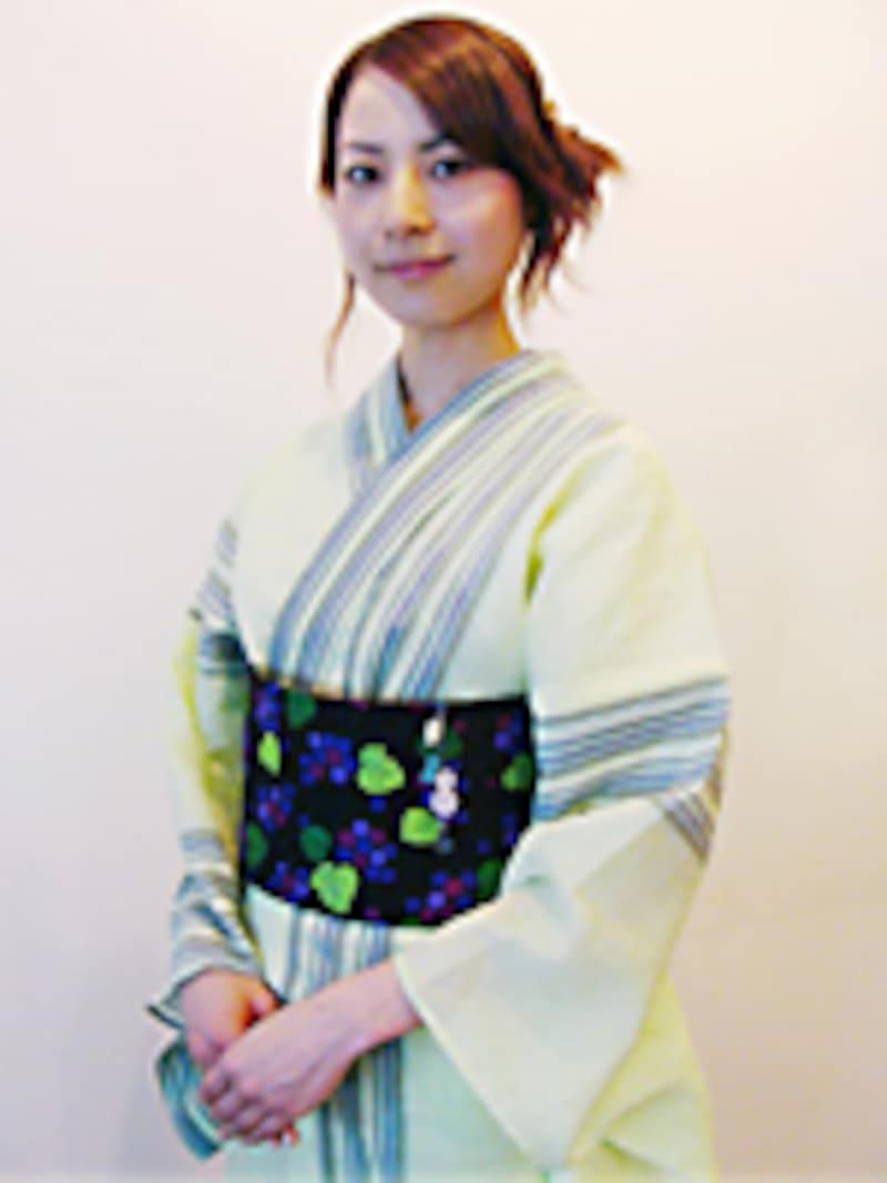 モデル着用の浴衣、帯、小物は[玉のり]の商品です。