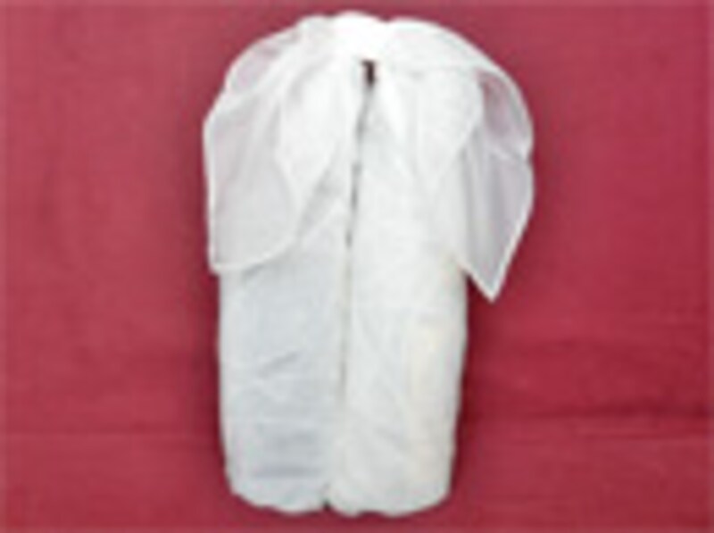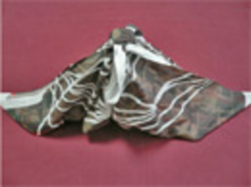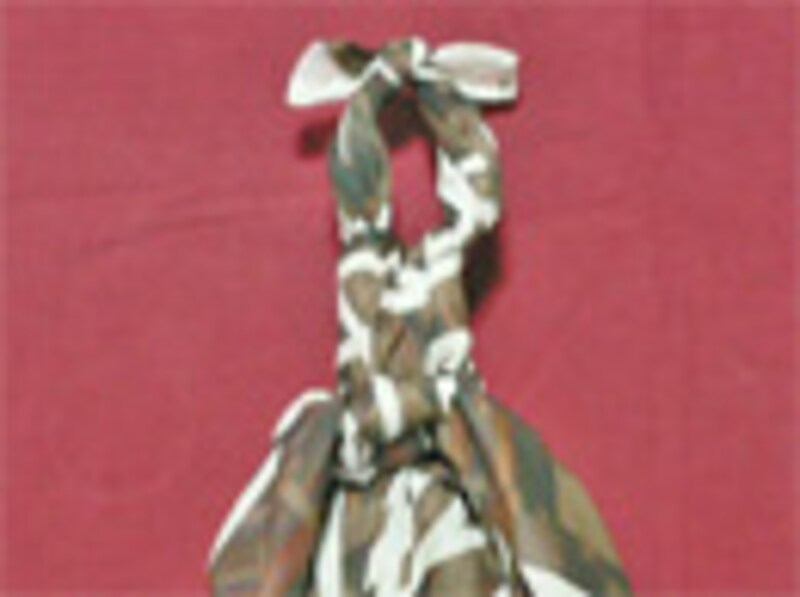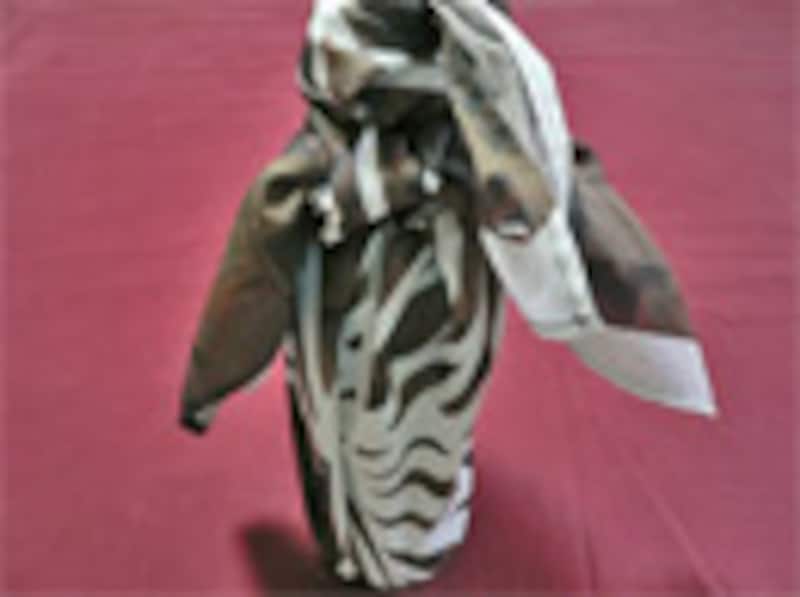 | 1:風呂敷の中央にボトルを立てて置き、手前と奥をボトルの上で真結びする。 | 2:左右をボトルの首の後ろ側で交差させてから、正面で真結びする。 | 3:ボトル上の真結びをひとつだけ解き、両サイドをねじりあげて真結びする。 |