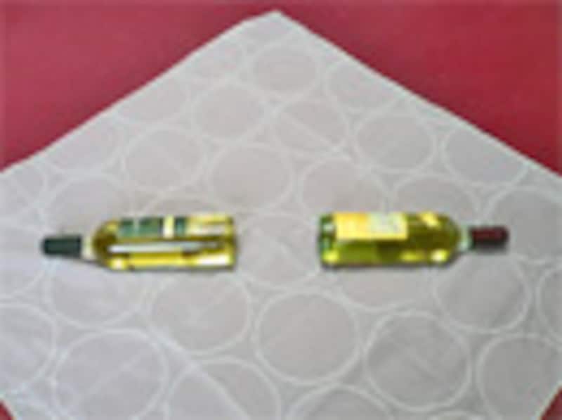 | 1:対角線上にボトルを寝かせ、底2本分の間隔をあけておく。 | 2:手前をかぶせ、奥まで転がしながら巻く。 | 3:ボトルを立てて、両サイドを真結びにする。 |