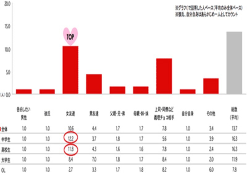 全体では、昨年チョコをあげた総人数は平均13.7人となっており、そのうちの10.6人が女友達となっています。世代別にみると、OLは義理チョコがトップですが、大学生は義理チョコと女友達への友チョコが共に首位。高校生と中学生では女友達への友チョコが断トツのトップとなっています。