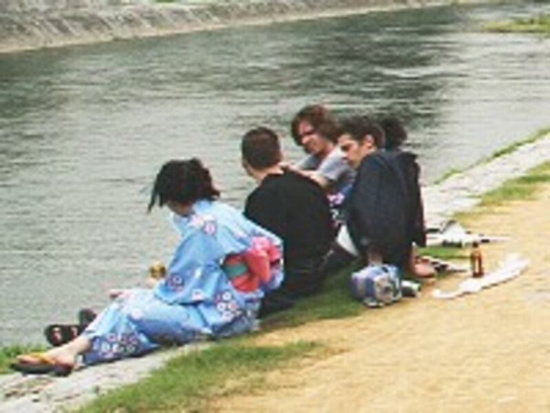 | 鴨川沿いにいた外国人のグループ。男性も全員浴衣で、粋に目立っていましたよ |