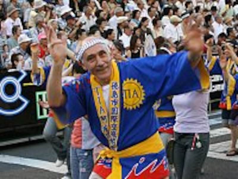 名前は「国際交流協会連」。徳島市国際交流協会が結成した連で、かなりの参加者がいました。お揃いのハッピを着て、ちゃんと祭り用の地下足袋を履いている人もチラホラ。初めての参加ではなさそうですねえ~。みなさん、日本のお祭りに参加していることを、心から楽しんでいらっしゃるようでした。