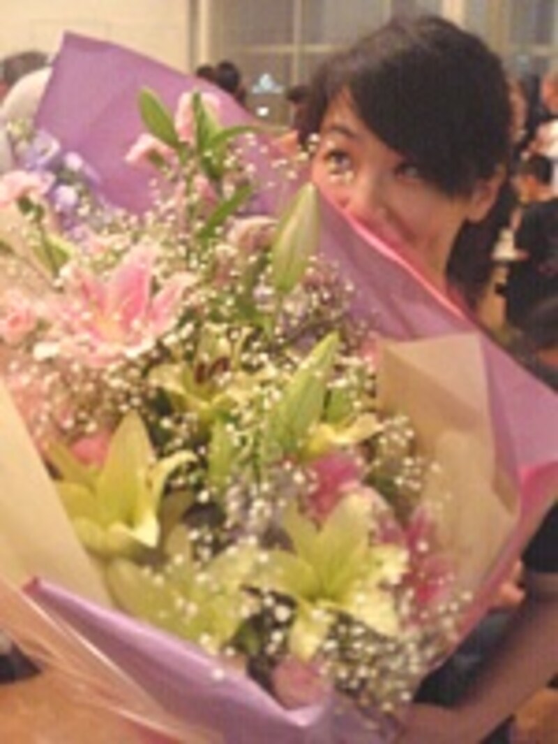 終了後の打ち上げには、スコットのご家族も参加。そこでサプライズ!! 突然、私とスコットが前に呼ばれ、太鼓チームの人たちからお祝いの花束をいただいてしまったのだ。もう泣けて泣けて、何も言えなくなってしまった。本当に素晴らしいチームに入ることができたなあと思う。今日のコンサートと打ち上げの出来事はきっと忘れない……。