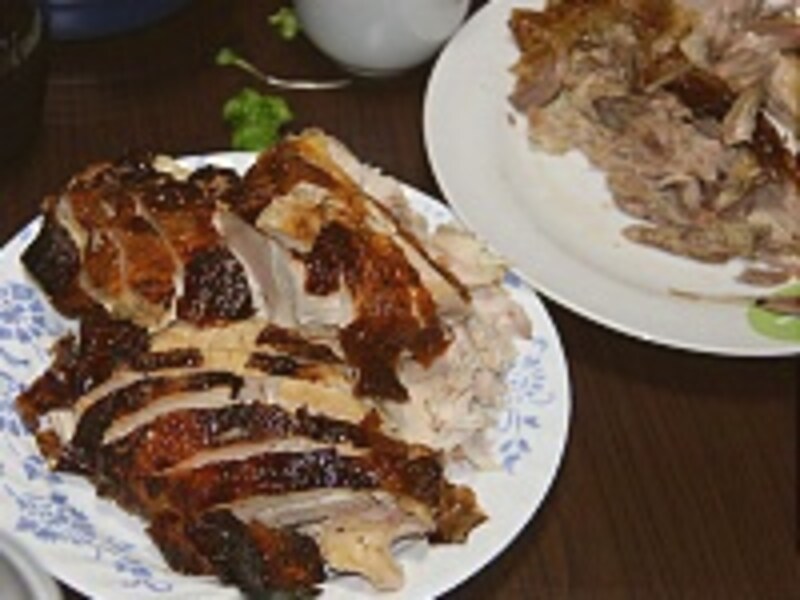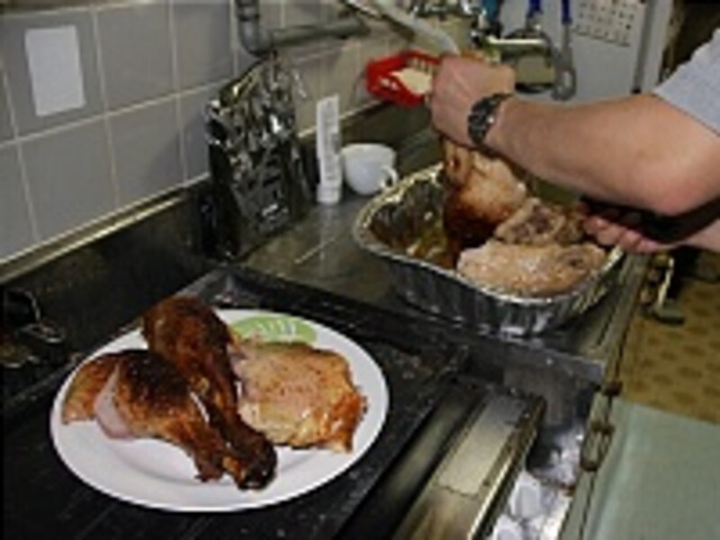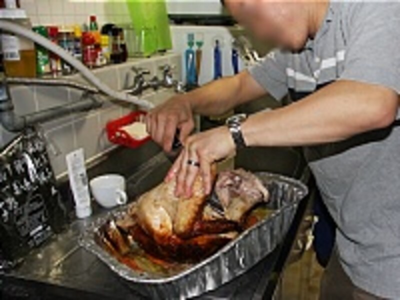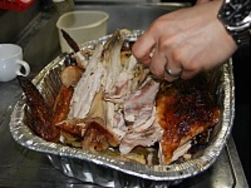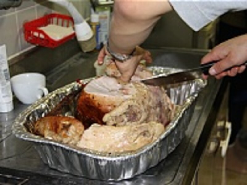 スコット・シェフの手際が冴える!スコットさんにはまだ仕事がありました。丸ごとのターキーをみなさんにお披露目した後、食べやすいようにさばかなければなりません。包丁を持って、いざ!まず足からカットします。もも、手羽などから、大きく切り分けていくのがコツ!白身の部分が大きくカットされていきます。切り口も美味しそう~♪白身が取り終わったら、次は骨に付いた赤身の部分を取り分けていきます。あっという間に、大きなターキー丸ごと1羽をきれいにさばいてしまいました~。お見事!!さあ、食べましょう~!!前のページへ1234次のページへ