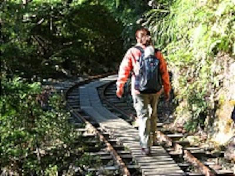 デコボコが少ないから一見歩きやすそうに見えるトロッコ線路ですが、自分の歩幅と枕木の間隔が合わないので、微妙に疲れます。後半は山道になりますので、ウォーキングシューズは不可。トレッキングシューズ(できれば足首を守るハイカット)で、服装や持ち物(食糧など)にも充分ご注意ください。