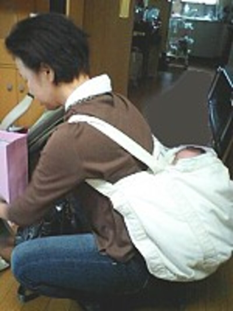 この日はお母さんのアイディアで、なんとお買物バッグに入れて背中に! 午前中寝なかったサヤちゃんが、これでコロッと2時間眠り続けたそうです。お母さんによると、おなかの中にいるような気持ちなのだとか。直美さんいわく「私たち兄弟の育ち方が分かりました(苦笑)」