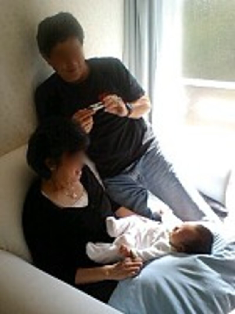 | 時差とお疲れでか、サヤちゃんを抱っこしたまま居眠りしてしまった新おじいちゃん |