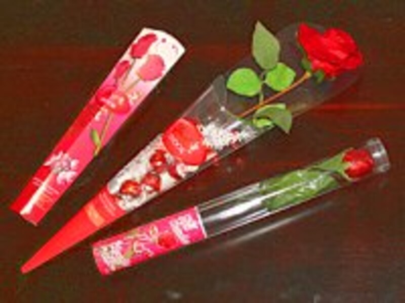 中央は、キャンディ型のチョコレートを詰めた袋に、本物っぽい深紅のバラの造花が一輪ついたもの。