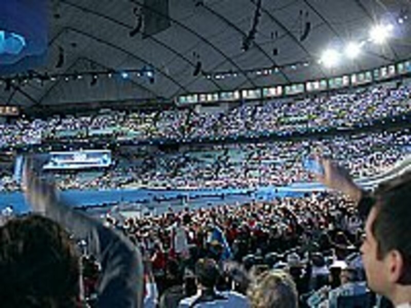 会場の照明が落ちて、観客へのリハーサルの始まりです。ステージ上にMCが2人登場。1人はCTV(カナダのテレビ局)でおなじみのお天気キャスターの女性でした。実際のレクチャーは、会場担当の女性が行ない、大スクリーンにも彼女が映し出されます。![]() |