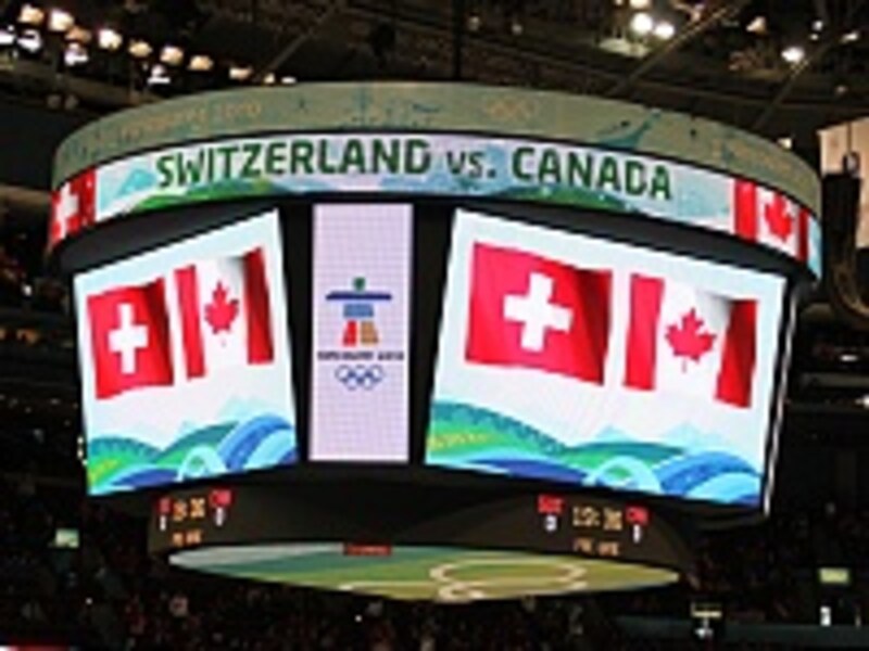 | ホッケー会場の中央モニターには両国の国旗と「SWITZERLAND vs CANADA」の文字がくっきり |