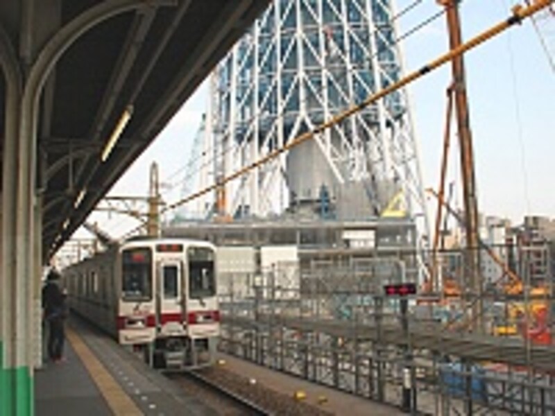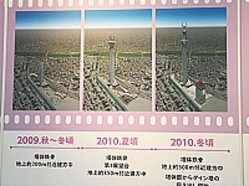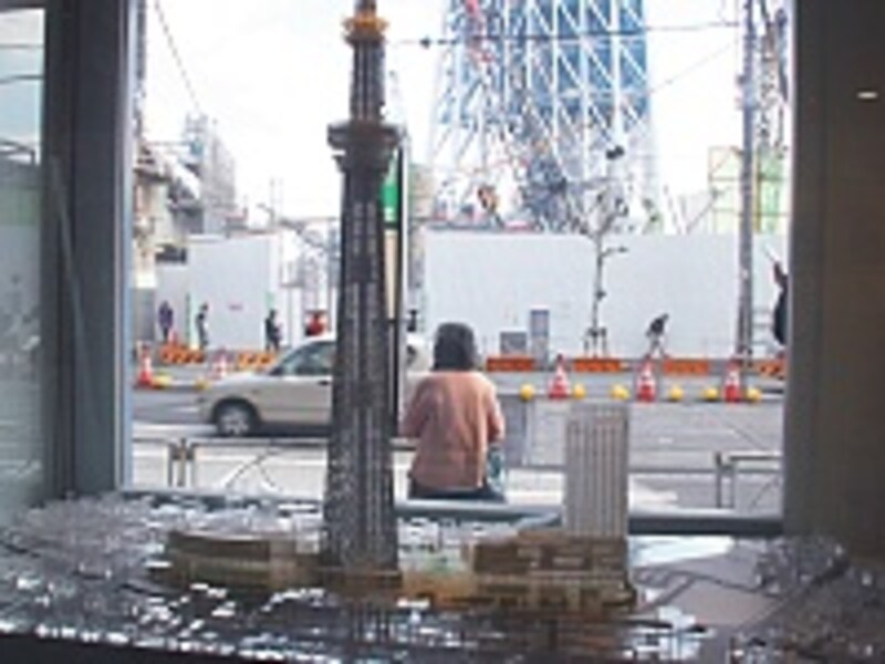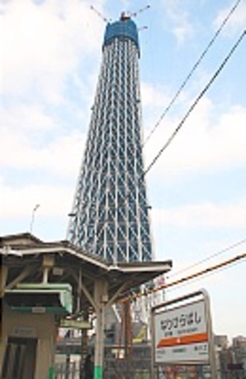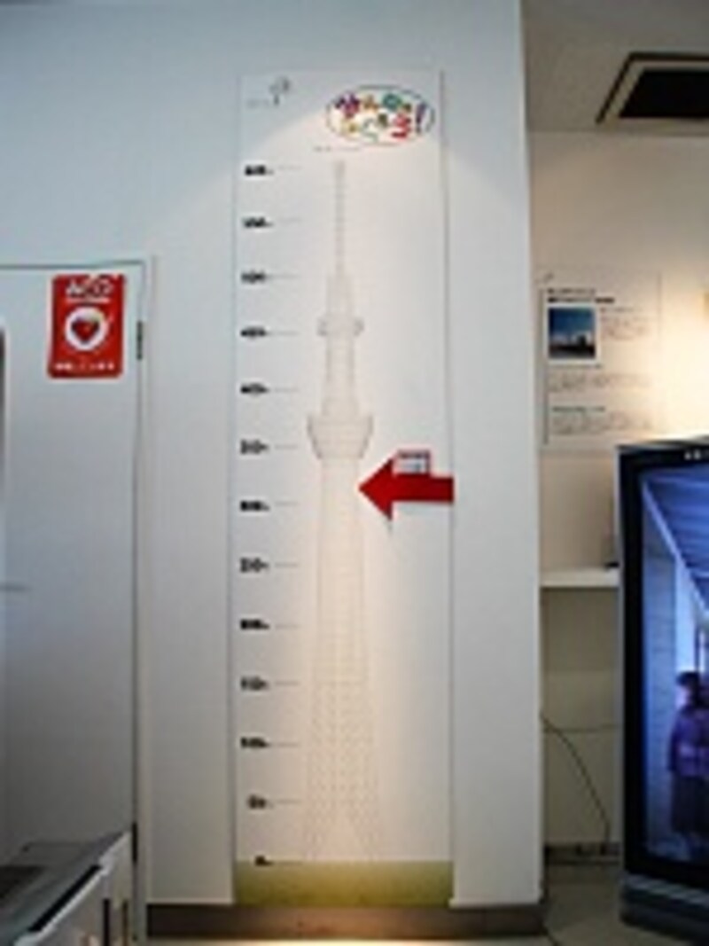 インフォプラザで情報ゲット東京スカイツリーの建築現場は、東武伊勢崎線の業平橋(なりひらばし)駅のすぐ横です。その業平橋駅前に「東京スカイツリー インフォプラザ」があります。小さいスペースですが、興味深い展示もありますので、時間があったら立ち寄ってみるといいかも……。赤い矢印で現在の高さを示しています。やはり今“半分”くらいですね。この図を見ると分かりますが、まだ第1展望台まで達していないのです。あんなに高いのに……これは途中経過を示す予想図。今年の夏頃には、地上約350メートルの位置に第1展望台が作られている模様(中央の図)。実物の1/500サイズの高精度建築模型。窓の向こうには本物の東京スカイツリーが……。業平橋駅から業平橋駅は高架になっているので、そこからも建築現場がよく見えます。興味がある方は行ってみては?ただし、ホームの両側を電車が通りますので、写真撮影に夢中になって乗り出したりしないよう、くれぐれも気をつけてください!! 撮影は必ず白線の内側で。そして隅田公園では、なんと桜が……!?前のページへ12345次のページへ