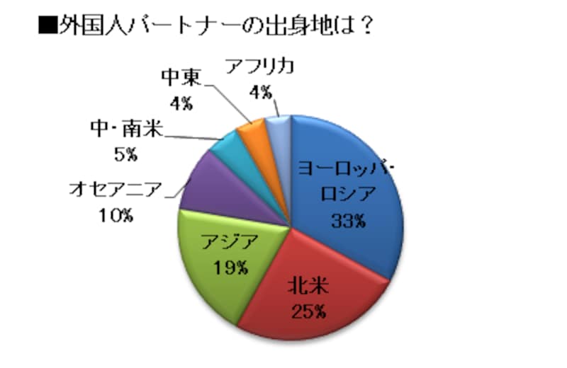 3分の1のカップルはパートナーがヨーロッパ・ロシア出身、4分の1はアメリカ・カナダ出身、5分の1はアジア出身となっています。これはAll About「国際結婚」の読者のみなさんのプロフィールなので、実際の国際結婚のお相手の出身国(下の記事内)とは少し異なっています。
