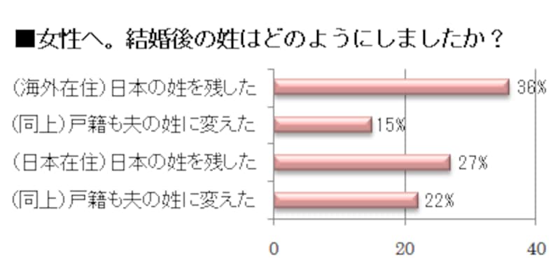 夫婦別姓でもかまわない国際結婚。海外在住なら、現地では夫の姓に変更し、日本では戸籍の名字のままにしておく女性が多いのではないかということは推察されましたが、意外にも、日本在住でも日本姓を残す女性が多かったのです。