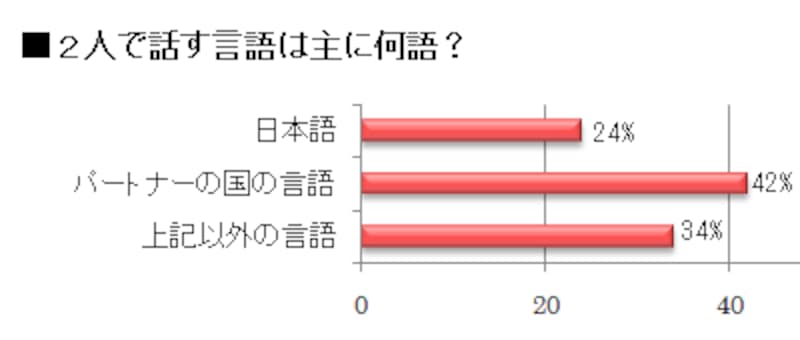 カップルの共通言語は、日本語が24%、外国語(パートナーの国の言語、および他の国の言語)が76%。上の居住国に関するデータと比べてみると、日本に住んでいるからといって、必ずしも日本語で話しているとは限らないということが分かります。