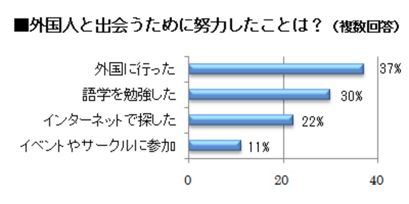 これは、外国人の異性と出会いたい・知り合いたいと思っていた人への質問です。複数回答OKだったので、全部トライしていた方もいるかもしれません。