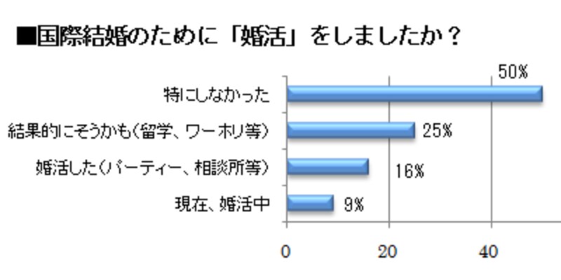 このような結果になりました。半数の人は何もしなかったそうです。4分の1の人は、留学やワーキングホリデーで海外に行ったために出会いがあり、結果的にはそれで結婚にまで至っています。