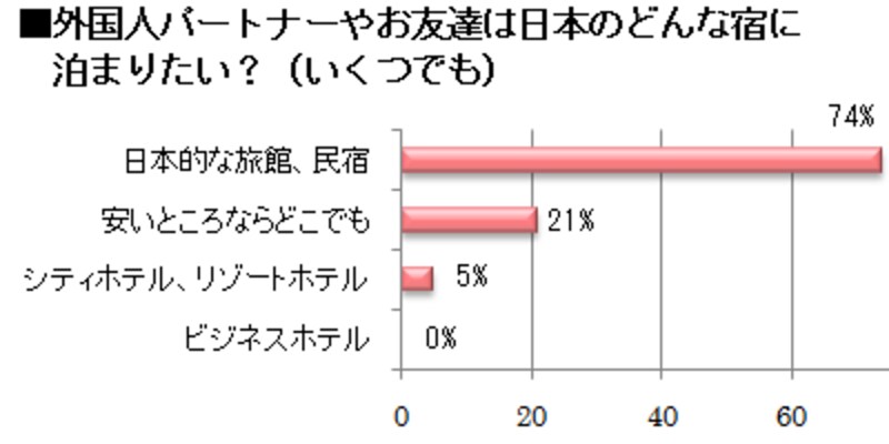 複数回答にしましたが、圧倒的に「日本的な旅館、民宿」に泊まりたいという答えが多かったです。日本の旅館は高いと言われていますが、2食付きで夕食はたいてい伝統的な日本料理がいただけるし、和室や浴衣など日本の文化を一気に体験できるとあって、近年は人気が高まっています。「少なくとも1泊は旅館に泊まりたい」という方が多いので、そんなプランニングをしてあげるといいかもしれません。