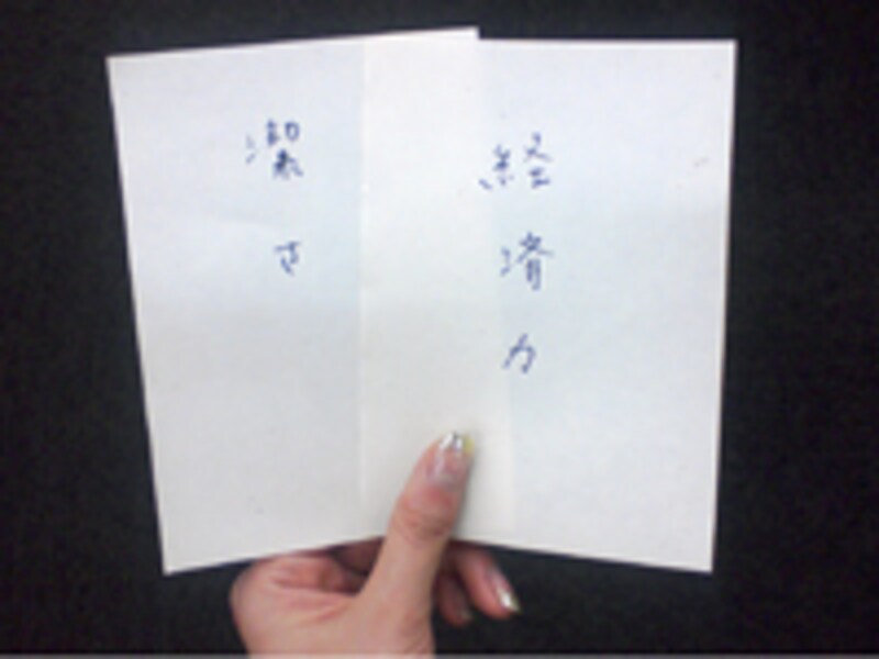 2.8枚を裏返して、その中から2枚引く。その2枚のうちで、より、譲れないほうを選び、どちらかを捨てる。たとえば、「優しい」と「ガタイがいい」を引いたら、「優しいけど、骨細な人」と「ガタイはいいけど、全然、優しくない人」をどちらがいいのか、“究極の選択”風に問答していく。