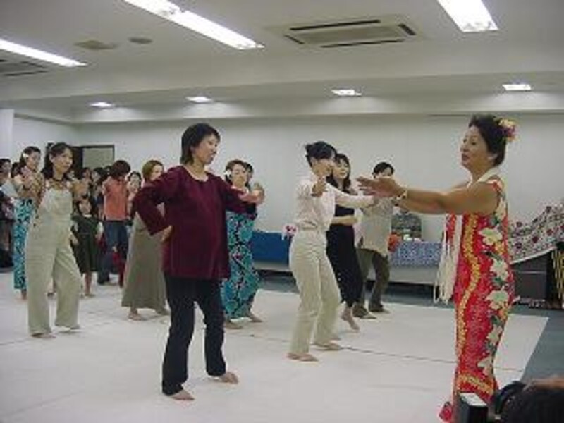 まずは、お手本のデモンストレーション。後列右奥で踊っている方は、妊娠7カ月とのこと。「妊娠中は鬱血しやすい感じがするので、フラダンスをして体を動かすと気持ちいい」と言ってらっしゃいました。