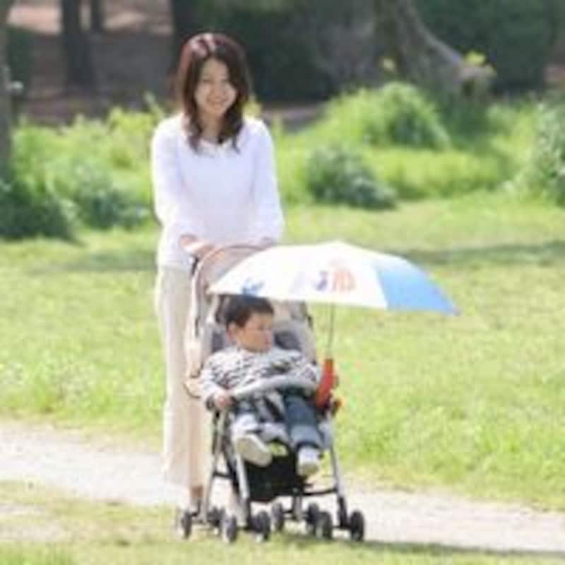 晴れている日でも、抱っこ紐で抱っこして、ママが傘をつければ、親子で紫外線対策もできます。