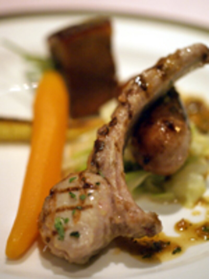 「イタリア産 仔豚の三味仕立て ロース肉のグリル ハーブ風味 肩肉のブレぜ 蜂蜜スパイス風味 もも肉のソーセージ」は、やわらかく繊細な味わいのロース肉、中華っぽいテイストの肩肉、噛むほどに美味なソーセージの盛り合わせで、とりわけロース肉のグリルが印象的でした。