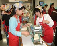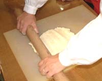 まず、手で粉をこねるところから始めます。うまくこねることができたら、ローラーを使って、何度も薄く延ばし、きめ細やかな生地に仕上げていきます。きめ細やかな生地ができたら、生地を休めます。