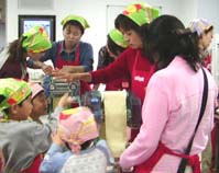 テーブルに準備されている三角巾とエプロンを身につけ、手を丁寧に洗い、まずは、ビデオで作り方の説明を聞きます。