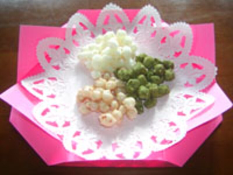 ひなあられの入れ物の作り方 (1)色画用紙を半分に折り、写真のように4つの角を折る。 (2)裏返して、写真のようにとがった先を折り、糊やセロテープなどで固定する。 (3)両端を写真のように折り上げ、4つの角も折り拡げる。 (4)出来上がり! ※日にちが経って、あられが湿ってしまったら、お皿に乗せ、電子レンジで数十秒温めて、冷ますと、また、カリッと歯ごたえよくなりますよ。【編集部おすすめの購入サイト】Amazonで子育て関連の商品をチェック!楽天市場で子育て関連の書籍をチェック!前のページへ123※記事内容は執筆時点のものです。最新の内容をご確認ください。