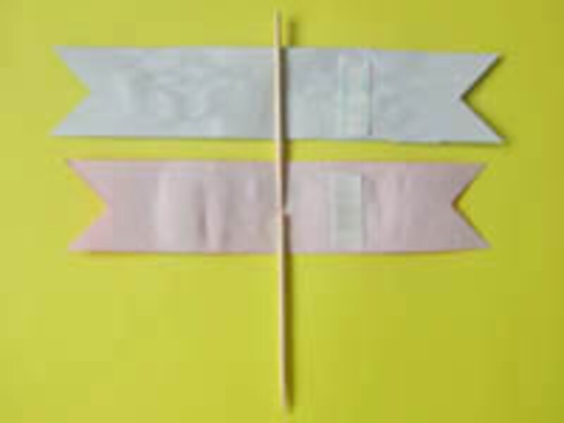 折り紙を4分の1のサイズに切り、かぶとを折る。爪楊枝を刺し、かぶとピックを作る。