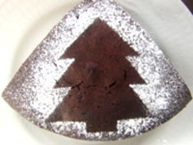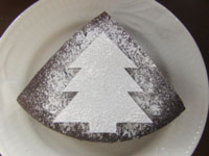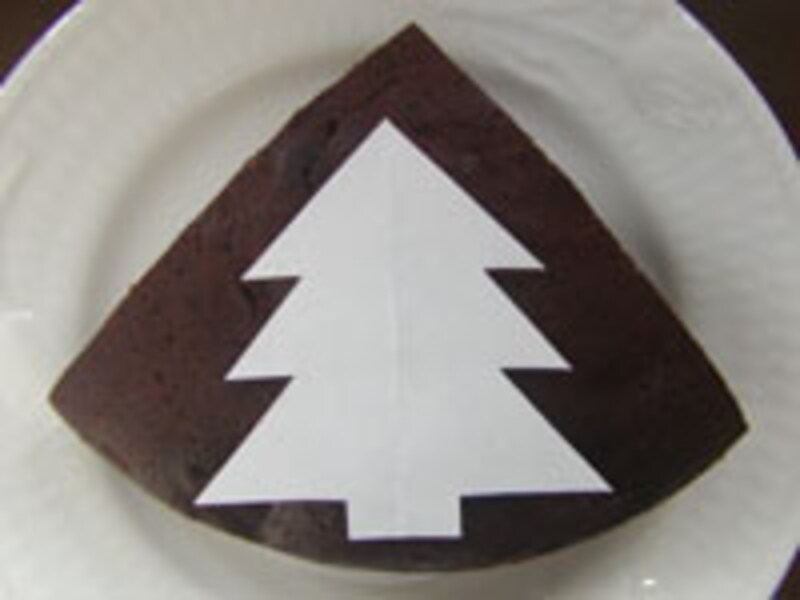 ・ケーキを4等分した大きさぐらいの紙を半分に折る。・クリスマスツリーなどを半分にした絵を描く。・絵を切り取り、紙を広げ、4等分したケーキの上に置く。・紙の上から、パウダーシュガーを茶こしでふるう。・ケーキの上に置いた紙をそっと取って、出来上がり。前のページへ123次のページへ